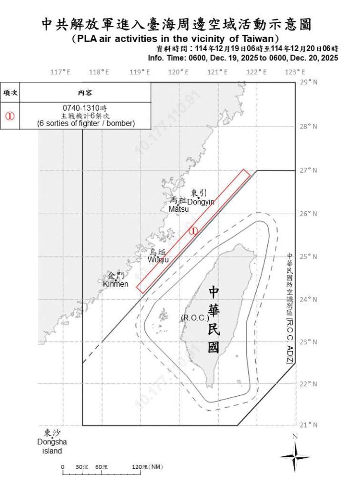 中共解放軍進入臺海周邊空域活動示意圖。(國防部提供) × 中共解放軍進入臺海周邊空域活動示意圖。(國防部提供) 下載浮水印圖 下載原圖 (軍聞社記者吳冠萱臺北20日電)國防部今日表示,至上午6時止,偵獲共機6架次、共艦11艘及公務船1艘,持續在臺海周邊活動。 國防部強調,國軍運用任務機、艦及岸置飛彈系統嚴密監控與應處。 關鍵字 共機 共艦 回上頁 您的瀏覽器似乎不支援JavaScript語法,這裡的JavaScript語法並不會影響到內容的陳述,使用鍵盤快速鍵「ALT鍵+←向左鍵」替代回上頁。