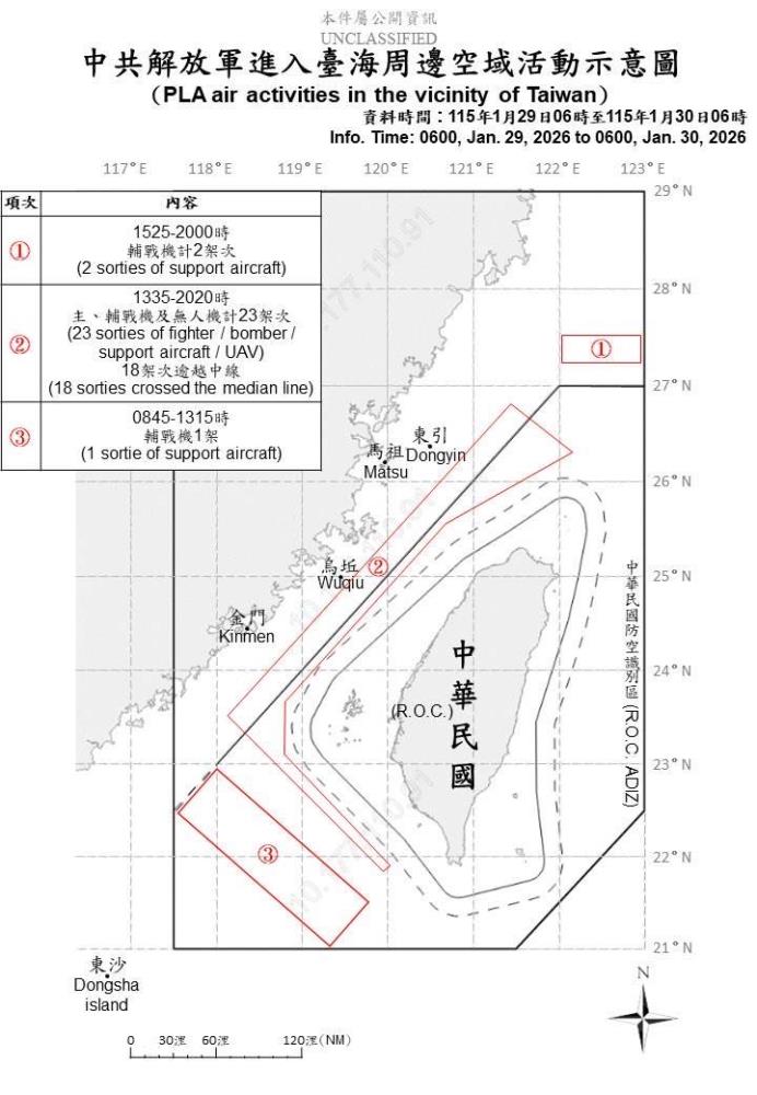 中共解放軍進入臺海周邊空域活動示意圖。(國防部提供) × 中共解放軍進入臺海周邊空域活動示意圖。(國防部提供) 下載浮水印圖 下載原圖 (軍聞社記者吳柏融臺北30日電)國防部今日表示,至上午6時止,偵獲共機26架次(逾越中線進入北部、中部及西南空域19架次)、共艦6艘及公務船1艘,持續在臺海周邊活動。 國防部強調,國軍運用任務機、艦及岸置飛彈系統嚴密監控與應處。 關鍵字 共機 共艦 回上頁 您的瀏覽器似乎不支援JavaScript語法,這裡的JavaScript語法並不會影響到內容的陳述,使用鍵盤快速鍵「ALT鍵+←向左鍵」替代回上頁。