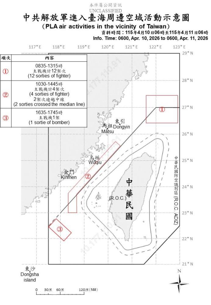 中共解放軍進入臺海周邊空域活動示意圖。(國防部提供) × 中共解放軍進入臺海周邊空域活動示意圖。(國防部提供) 下載浮水印圖 下載原圖 (軍聞社記者蔡枋澐臺北11日電)國防部今日表示,至上午6時止,偵獲共機17架次(逾越中線進入北部及西南空域15架次)、共艦7艘及公務船1艘,持續在臺海周邊活動。 國防部強調,國軍運用任務機、艦及岸置飛彈系統嚴密監控與應處。 關鍵字 共機 共艦 回上頁 您的瀏覽器似乎不支援JavaScript語法,這裡的JavaScript語法並不會影響到內容的陳述,使用鍵盤快速鍵「ALT鍵+←向左鍵」替代回上頁。