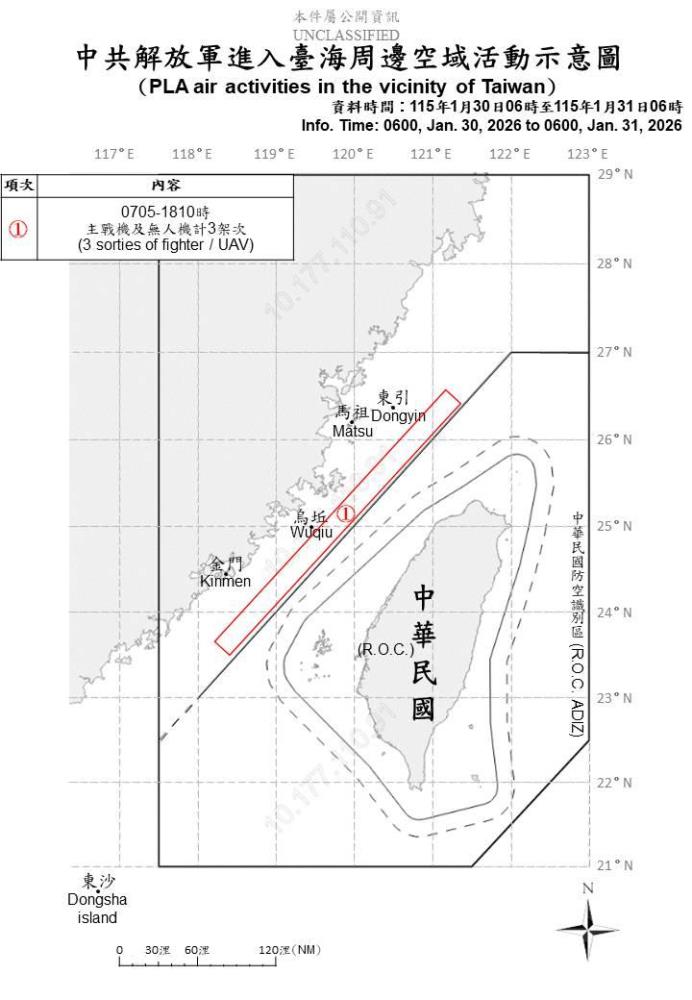 中共解放軍進入臺海周邊空域活動示意圖。(國防部提供) × 中共解放軍進入臺海周邊空域活動示意圖。(國防部提供) 下載浮水印圖 下載原圖 (軍聞社記者吳柏融臺北31日電)國防部今日表示,至上午6時止,偵獲共機3架次及共艦8艘,持續在臺海周邊活動。 國防部強調,國軍運用任務機、艦及岸置飛彈系統嚴密監控與應處。 關鍵字 共機 共艦 回上頁 您的瀏覽器似乎不支援JavaScript語法,這裡的JavaScript語法並不會影響到內容的陳述,使用鍵盤快速鍵「ALT鍵+←向左鍵」替代回上頁。