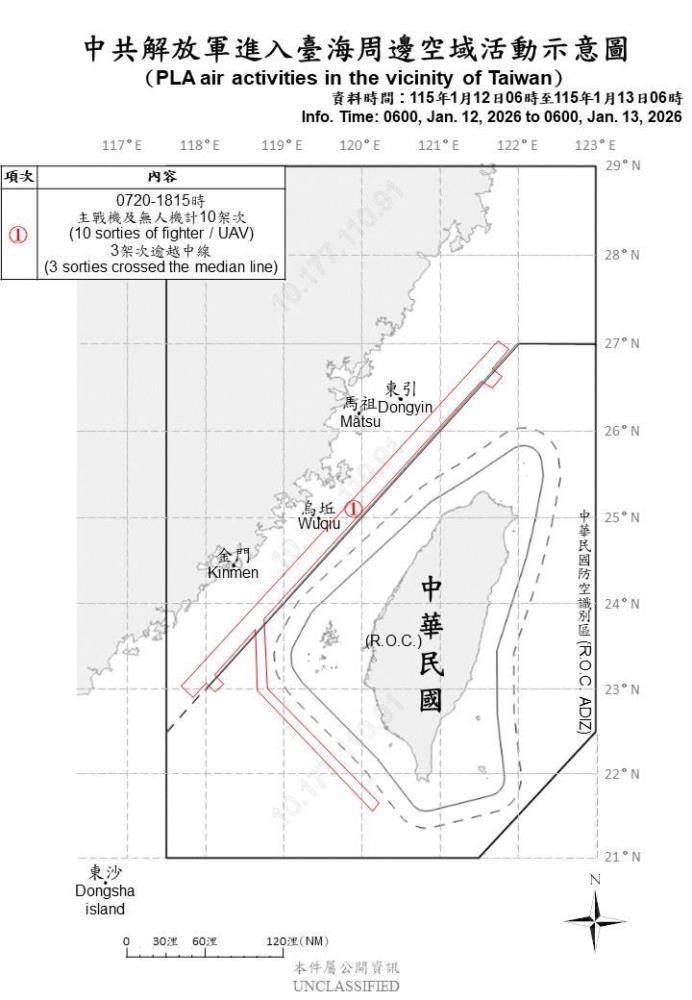 中共解放軍進入臺海周邊空域活動示意圖。(國防部提供) × 中共解放軍進入臺海周邊空域活動示意圖。(國防部提供) 下載浮水印圖 下載原圖 (軍聞社記者尤昱翔臺北13日電)國防部今日表示,至上午6時止,偵獲共機10架次(逾越中線進入北部及西南空域3架次)及共艦5艘,持續在臺海周邊活動。 國防部指出,國軍運用任務機、艦及岸置飛彈糸統嚴密監控與應處。 關鍵字 共機 共艦 回上頁 您的瀏覽器似乎不支援JavaScript語法,這裡的JavaScript語法並不會影響到內容的陳述,使用鍵盤快速鍵「ALT鍵+←向左鍵」替代回上頁。