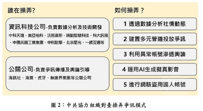 國安局表示,中共黨政軍系統設定爭議訊息敘事主題和基調後,動員資訊科技公司、公關公司及網路水軍集團等協力組織,對我國目標受眾傳散爭議訊息。其中,在「透過數據分析社情動態」方面,中共網信辦、「國安部」、共軍政治工作部運用「中科天機」、「美亞柏科」、「沃民高新」等科技公司,利用「爬蟲技術」,蒐集我國政治人物、民意代表與意見領袖的基本個資、人際網絡,以及對中共立場,並彙整我國選舉期間民調數據、網路聲量等資訊,以利「精準」執行對臺宣傳及攻擊特定人士。