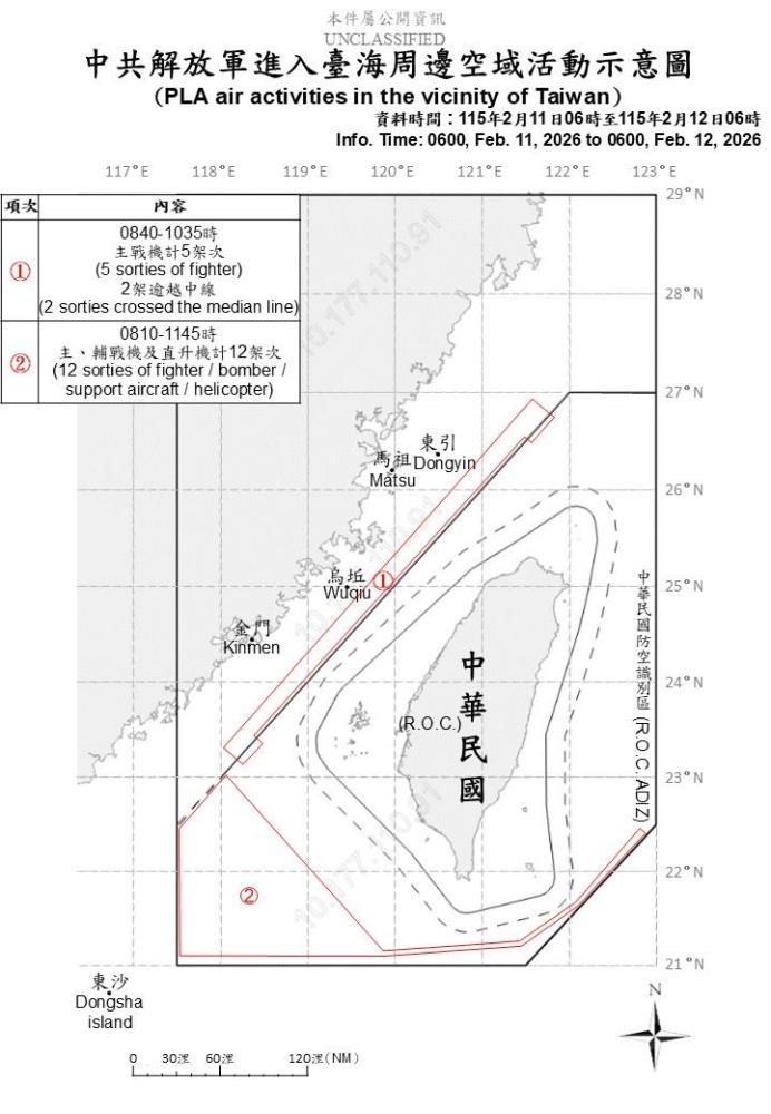 中共解放軍進入臺海周邊空域活動示意圖。(國防部提供) × 中共解放軍進入臺海周邊空域活動示意圖。(國防部提供) 下載浮水印圖 下載原圖 (軍聞社記者莊家豪臺北12日電)國防部今日表示,至上午6時止,偵獲共機17架次(逾越中線進入北部、西南及東南空域14架次)、共艦7艘及公務船1艘,持續在臺海周邊活動。 國防部強調,國軍運用任務機、艦及岸置飛彈系統嚴密監控與應處。 關鍵字 共機 共艦 回上頁 您的瀏覽器似乎不支援JavaScript語法,這裡的JavaScript語法並不會影響到內容的陳述,使用鍵盤快速鍵「ALT鍵+←向左鍵」替代回上頁。