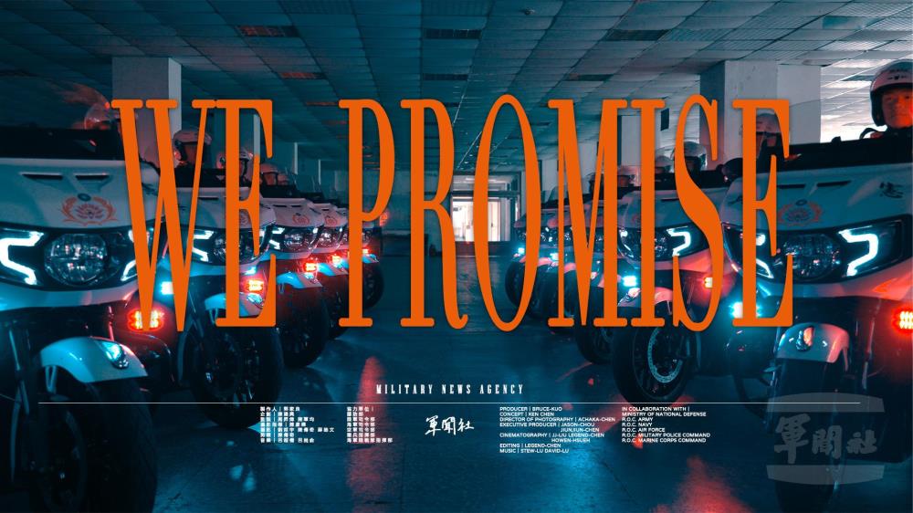 本次影片歌曲《We Promise》是由陸軍53工兵群呂超儒中尉與軍聞社新聞官呂尚俞少校共同製作。歌曲從沉穩的低頻節奏出發,象徵軍人內心堅定的信念。歌詞核心圍繞「承諾」,描寫官兵在天未亮前即整裝待發,在人們熟睡時仍默默守護的身影。影片尾段更別具匠心地加入「中華民國陸海空軍軍人讀訓」,透過官兵精神煥發的讀訓聲,與現代樂章結合,展現對土地、對家園的回應,是責任,更是永不退縮的選擇。