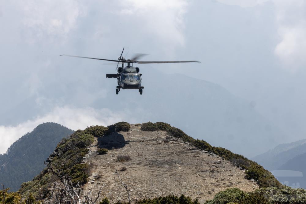 空軍救護隊黑鷹直升機9日執行交通部玉山氣象站運補任務,飛行官克服高山地形與不穩定氣流等挑戰,飛赴海拔3800公尺的玉山氣象站,載運補給物資,維持站內人員生活所需,展現優異的飛行技術,同時也確保高山氣象觀測作業穩定運作。(軍聞社吳柏融)